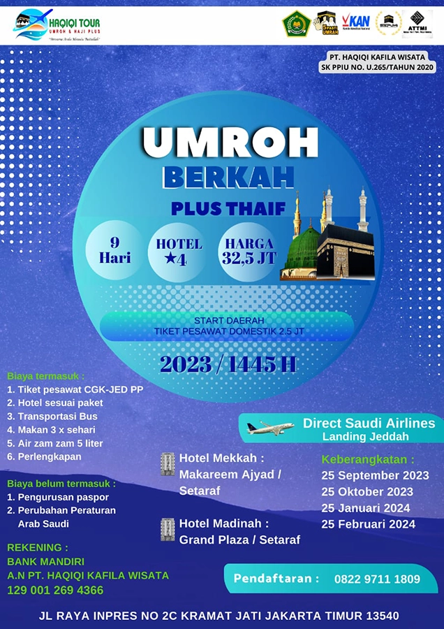 Paket Umroh Berkah adalah salah satu pilihan paket umroh terbaik yang dimiliki oleh Haqiqi tour, karena harga paket umroh ini sangat terjangkau dengan fasilitas hotel berbintang 4 terbaik di kelasnya, dan  menggunakan pesawat Saudia air direct Jeddah.